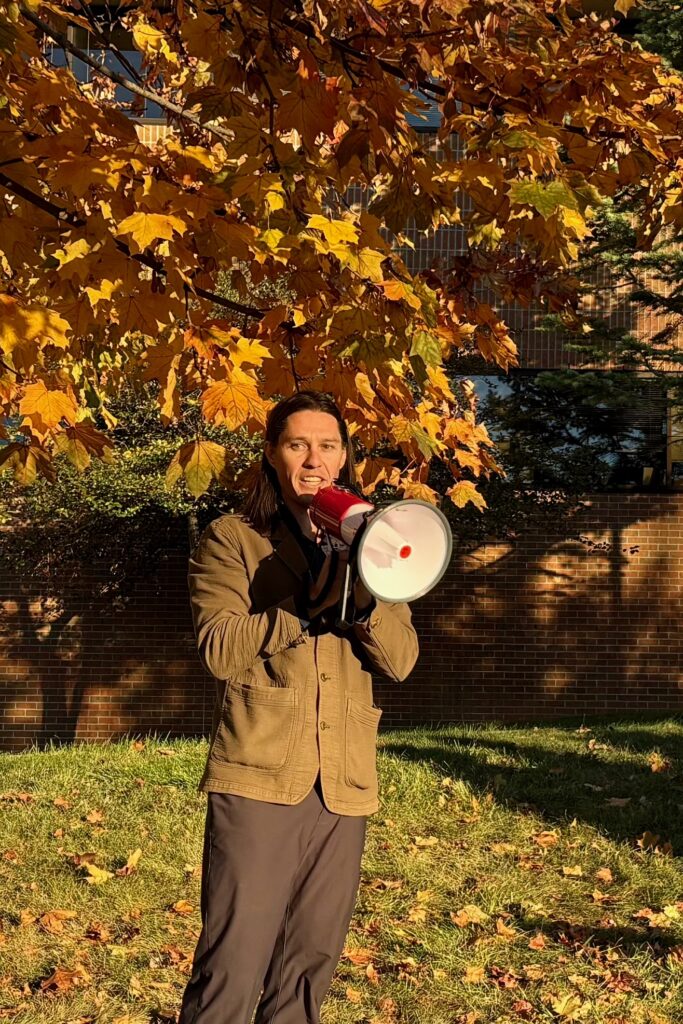 Bryan Smigielski, campaign organizer for the Michigan Sierra Club, speaks to demonstrators at a rally over the impact data centers have on the environment and ratepayers. Oct. 27, 2025. Photo by Brian Allnutt/Planet Detroit.
