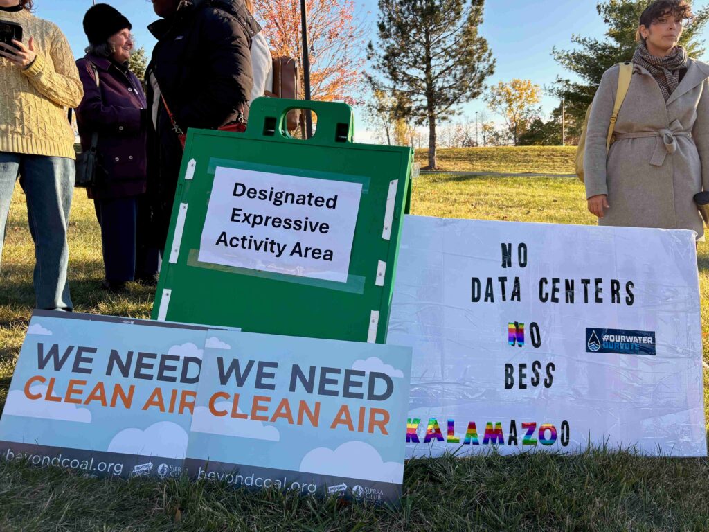 The “designated expressive activity area” at a data center demonstration Monday, Oct. 27, 2025 at the Oakland Community College Auburn Hills campus. Photo by Brian Allnutt/Planet Detroit.