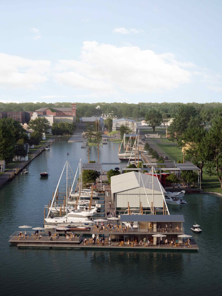 To honor the site’s history along the Stanton Canal, the design ties together existing buildings and a functioning marina into a single arts-focused campus that blends art with nature.