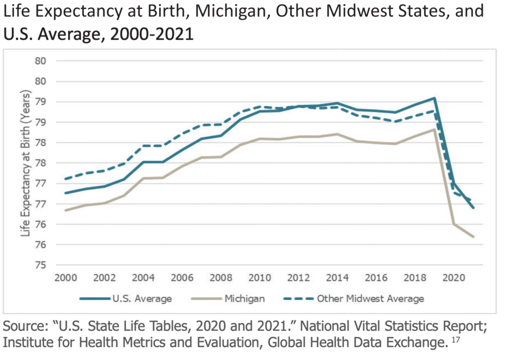 - Michigan ranks below the national average and its Midwestern peers across most major health outcomes, including life expectancy, premature death, self-reported health status, and chronic disease rates.