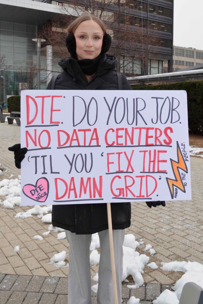 “Contrary to what DTE says, this is going to raise energy bills for every DTE customer,” she said, holding a sign that said: “DTE, do your job. No data centers ’til you fix the damn grid.”