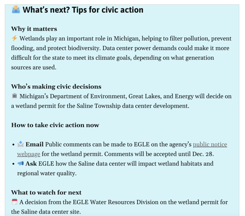 Every major accountability story includes a civic action box — a simple tool that answers “What can I do about this?” Whether it’s checking if your home has lead pipes, filing an air quality complaint, understanding your energy bill, or connecting with a community health worker, these boxes eliminate the friction between learning about a problem and taking concrete steps to address it. We don’t just want you informed: we want you equipped.