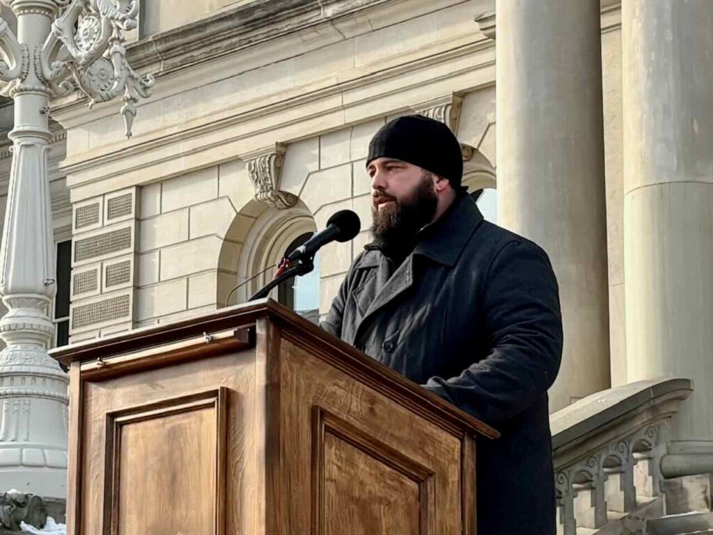 Clean Water Action’s Sean McBrearty speaks at a Dec. 16, 2025 anti-data center rally at the Michigan Capitol. Photo by Brian Allnutt/Planet Detroit.