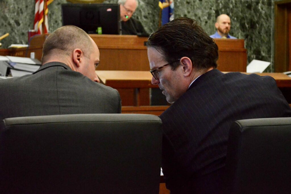 Wayne Disposal attorneys Scott Watson, left, and William Leeder confer Feb. 11, 2026 in Wayne County Circuit Judge Kevin Cox’s courtroom. Photo by Dustin Blitchok/Planet Detroit.